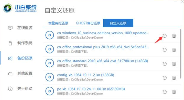 2、然后我们在小白一键重装的备份还原页面内选择自定义还原,点击系统iso镜像文件后面的还原按钮。