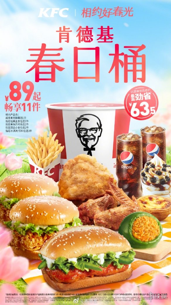 一桶美味作伴,开启春日赏味之约~肯德基春日桶今日惊喜上线!足足11款超值美味,89元起随心畅享,最高比菜单单品总价劲省63.5元~满满春意尽在桶中。