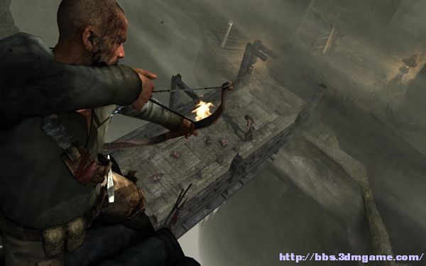 触发剧情,敌人砍断绳索并朝萝拉射箭,还好罗斯用狙击枪掩护,萝拉才有惊无险。往前找到营地:塔台远景,然后沿着古老的栈桥前行,跳过断桥(地图22)收到罗斯的通讯,往前爬窗进屋。一路攀爬到桥侧(地图23),这里不要擅动,听候罗斯的指令,等他解决目标再往前爬,爬上桥面(地图24)被敌人拉到下层,此时奔力逃跑,最后纵身攀到崖壁上(地图25)……