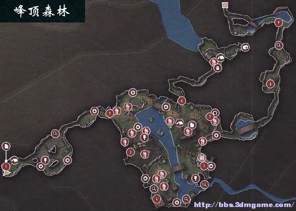 穿过木门往东走,在路左拾取蘑菇(3/10)。此时听到狼嗥和信徒的说话声(地图2),等敌人分散用弓箭狙头暗杀,总共三名。往桥头方向走,左侧的树桩后有一株蘑菇(4/10)。先不要过桥,沿着河流的西侧朝南方探索,找到一颗倾倒的树干,在它东北边相邻的树桩后找到蘑菇(5/10)。沿着倾斜树干走上去,跳到对面的石壁上,攀爬到上层平台(地图3),转身朝面望过去,纵身跳到相邻树干的木台上,爬索道抵达另一棵树台,从木台上拾取遗物:玉制祭典匕首。