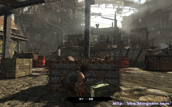 到码头与队员们会合,帮忙修船的时候需要滑轮组来吊起发动机,萝拉得前去收集滑轮。沿码头的断裂栈桥走,爬竖梯到起重机(地图6)上的平台,滑索到达对面的平台,往前跳横杆用斧头爬上石壁,往右翻窗进入废船(地图7)。