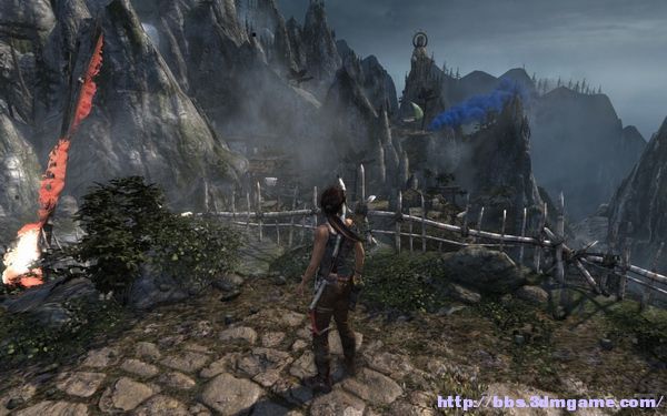 暴风雨终于停歇,阳光洒落,萝拉动身寻找食物。离开营地沿山道前行,看到树上悬吊着一具骷髅(地图2),背着一把长弓。爬上附近的石屋顶,走独木桥到树叉上,伸手取得弓箭。