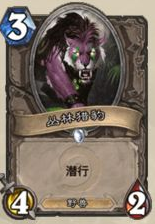3费42,准时下的话基本稳稳站住场面,2血在前期还是比较难死的,除了恶魔之怒和火山药水,闪电风暴,其他12费法术没法强都奈何不了猎豹,那在没带44给潜行BUFF情况下带猎豹的原因呢?这套牌3费确实多,扣去豹子还有7张,曲线不缺,主要是为了它野兽的种族能和馆长配合,前期抽不到的情况,后面可以依靠馆长拉上来,对手牌多一张的补给。
