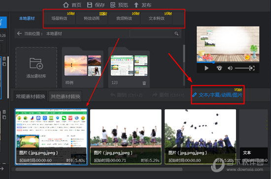 4、成功导入替换图片后,就可以添加各种特效啦,当然你也可以为自己图片添加滤镜或进行裁剪,只需要双击图片即可实现;在编辑完成之后,记得打开红框标注内的“文本/字幕/动画/图片”选项观看最终的视频相册效果,如下图所示: