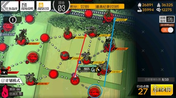 1.依次部署三个重装,按照红色和黄色线走动到黑雷位置,右侧的负责右上的四队走下一格部署路障队,消耗七个行动点。