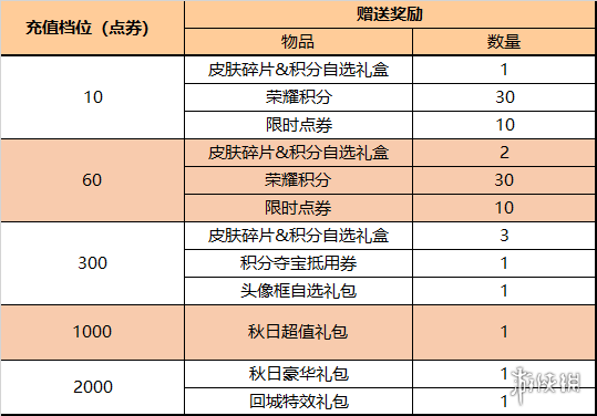 皮肤碎片&积分自选礼盒:打开礼包可任意选择以下奖励之一:荣耀积分*10或皮肤碎片*1