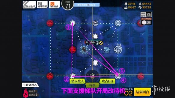 走法如图,下面支援梯队开局改待机,一共4回合。
