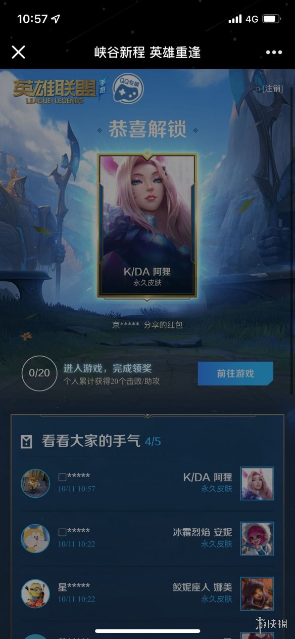 3、同时其他的玩家也可以分享给你,这样一共可以领取6个不同的英雄或者 皮肤,也需要玩家的运气了。