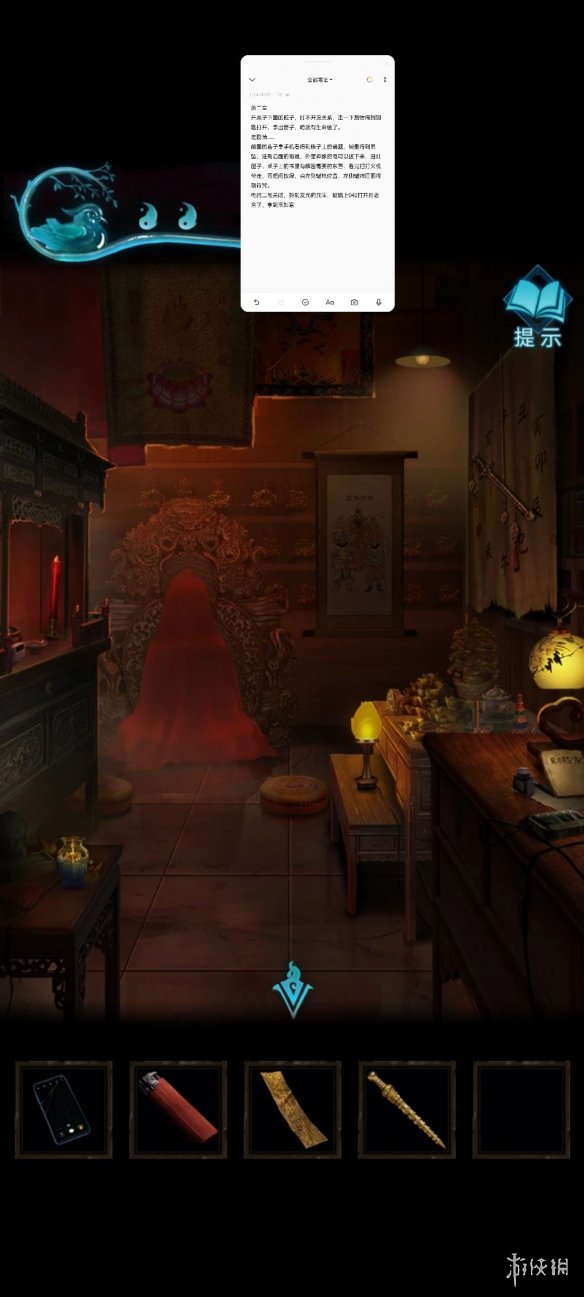 碗里得到吊坠,进到后面的街道,外面神像的电可以拔下来,进红屋子,桌子上的书里有解密需要的东西,看完把打火机带走,再把闸按绿,点左侧蜡烛位置,左侧蜡烛后面得到符咒。