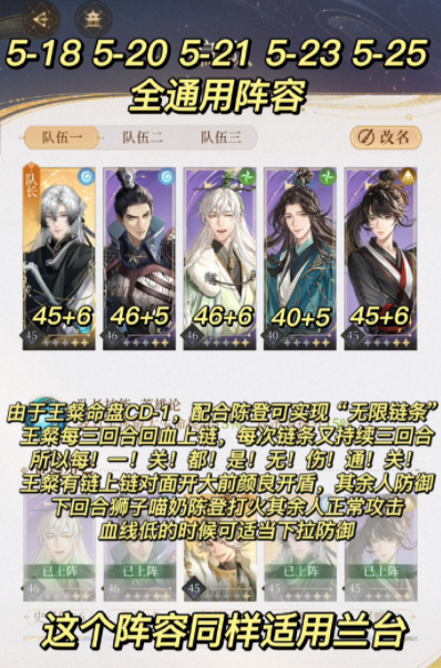 我是打到5-18才30级可以逆天改命,然后直接用这套阵容打通了主线,兰台从2-25也打通了。一关不卡,场场都是无伤通关,非常好用;