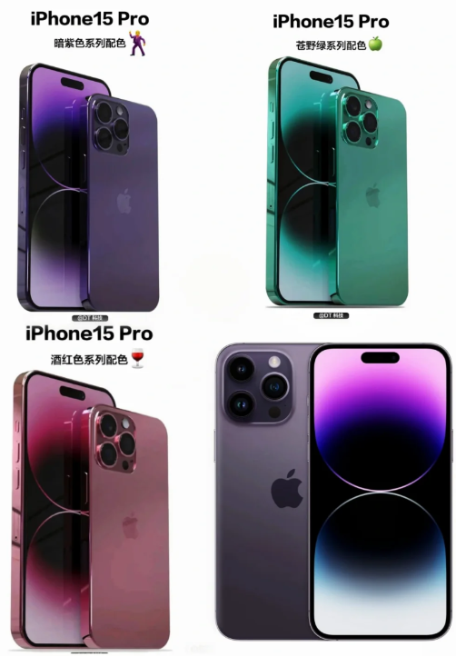 目前网上爆出了不少iPhone15Promax的新配色,除了经典的配色之外,这次苹果15系列也多出了不少全新的配色,比如暗紫色配色,苍野绿配色,酒红色等。