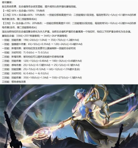 赵云重做简要概括就是被动新增三个血量档位,血量越低则自身越强。