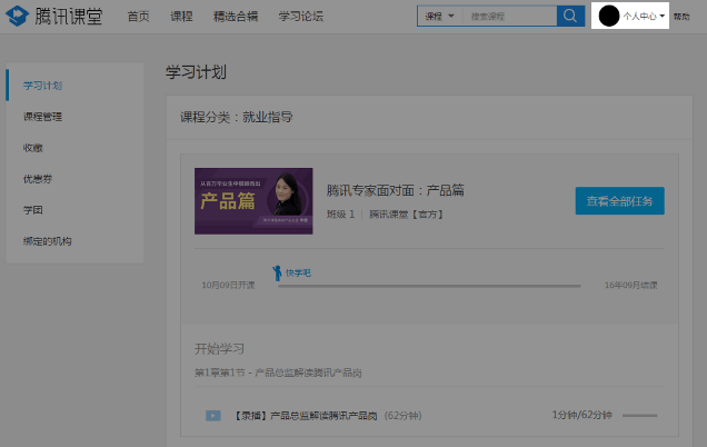 c)在ke.qq.com顶部导航栏的 “个人中心”-“学习计划”中,可以看到您所有的待学习的课程,点击每个课程的“查看全部任务“按钮可进入对应课程的任务列表中。