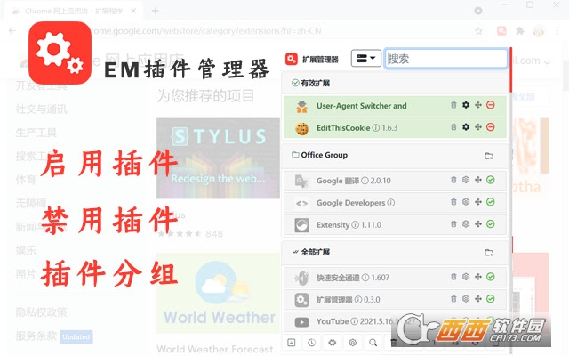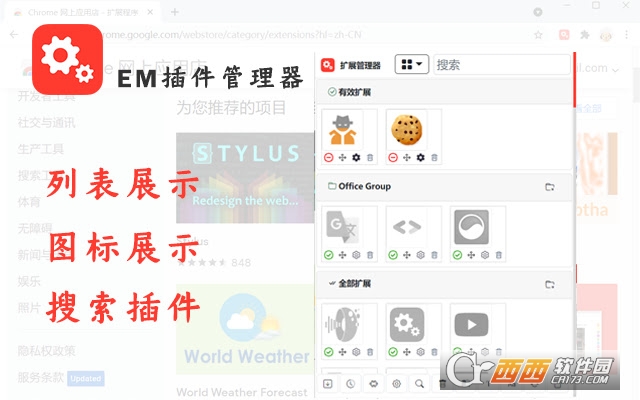 扩展管理器是一款扩展插件的管理器的软件,能够辅助用户来完成扩展和插件上面的管理,对于个人来说非常的实用的一款工具,特别是你chrome上面有着非常多的扩展之时,能够起到一个非常好的帮助的作用,让你的扩展得到更为有效的管理,快来下载这款扩展管理器!