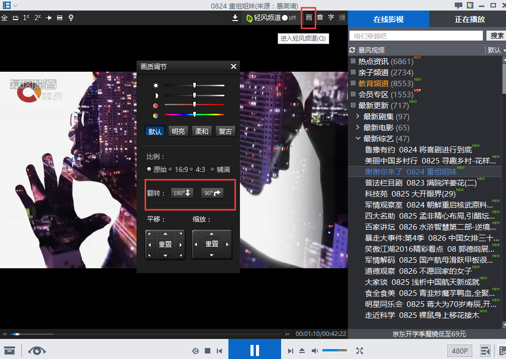 1、将鼠标移动到视频播放画面的最顶部,这时顶部右侧会出现“画、音、字、播”四个字样的小图标,点击【画】这个小图标;