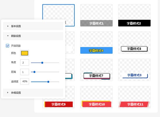 支持添加字幕和多行字幕,自定义字幕样式和外观,如阴影、背景色、文字样式和位置,一键同步当前字幕行样式。