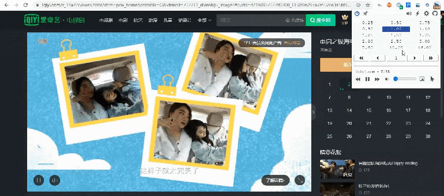 单击插件图标,可以看到0.25~16倍速的菜单框,单击你需要的速度即可切换当前视频的播放速度了。