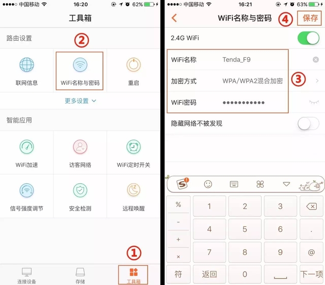 下载腾达路由APP(各大应用商店搜“腾达路由”即可下载),打开APP即可设置WiFi名称和密码,方法如下图所示▼