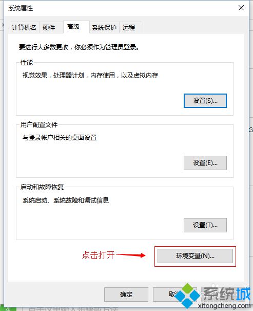 2、弹出“系统属性”对话框,选择系统属性下的“高级”标签。选择“启动和故障恢复”下的“环境变量(N)...“按钮,打开“环境变量”对话框。