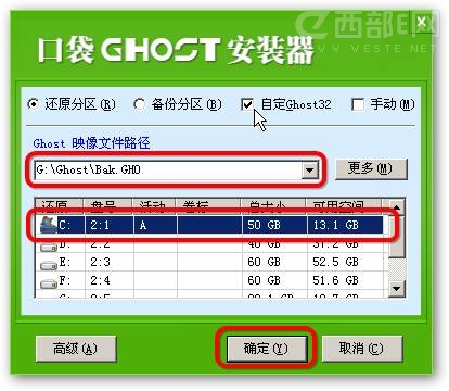 6.下面是安装还原分区,口袋GHOST安装器会自动识别你电脑上的所有分区。这里我们一般选择C盘进行安装。